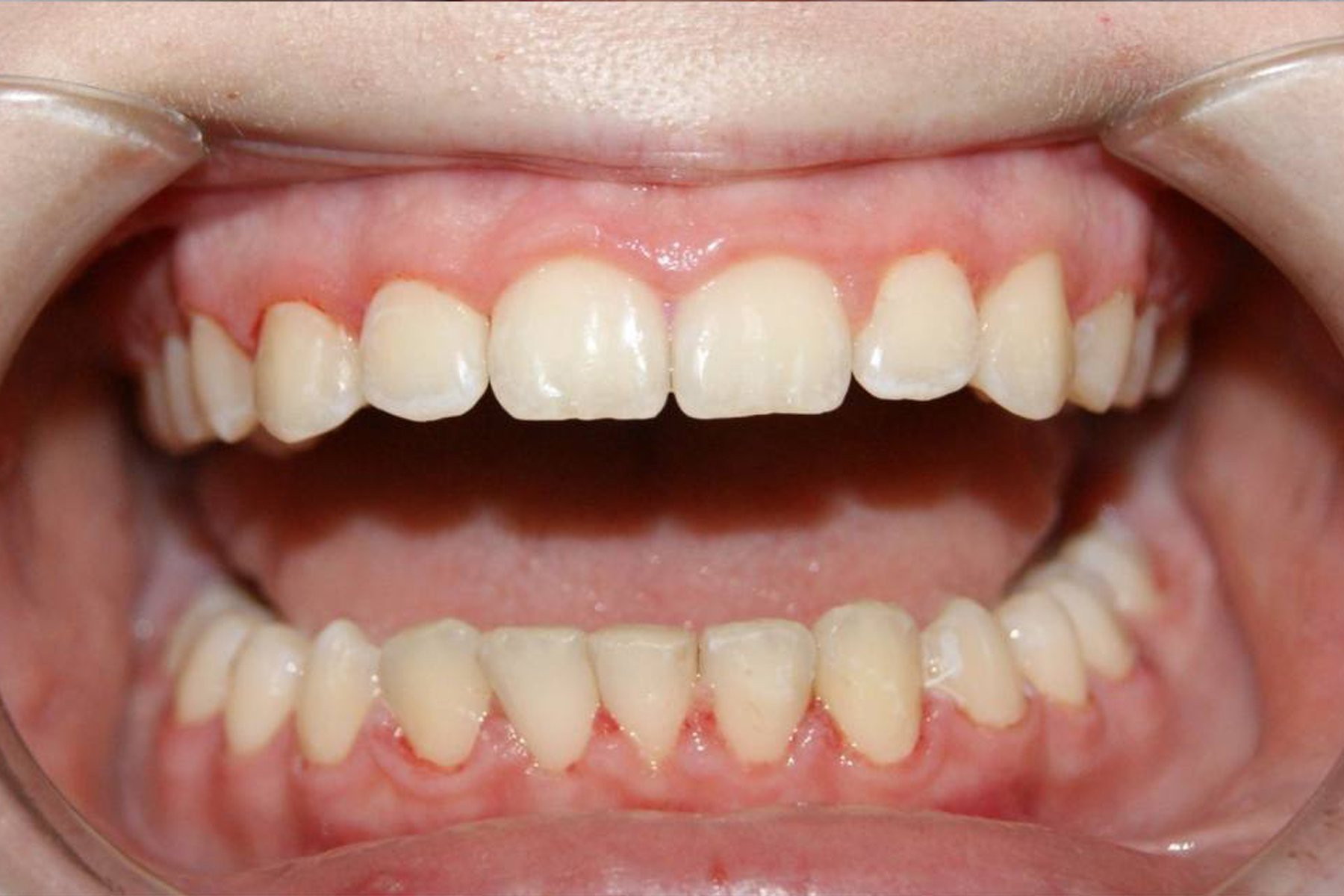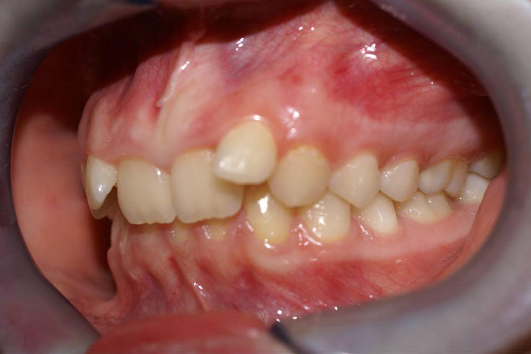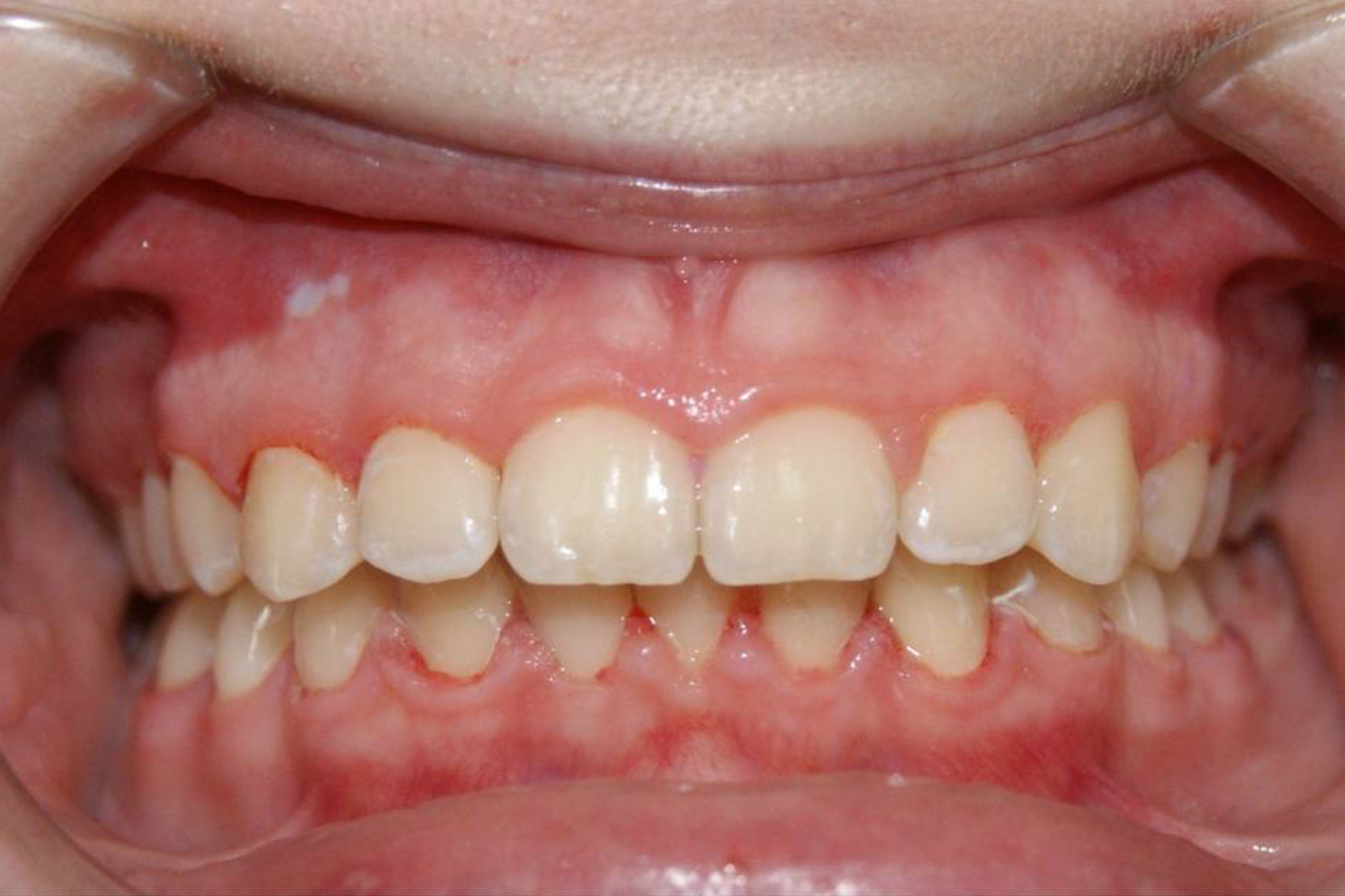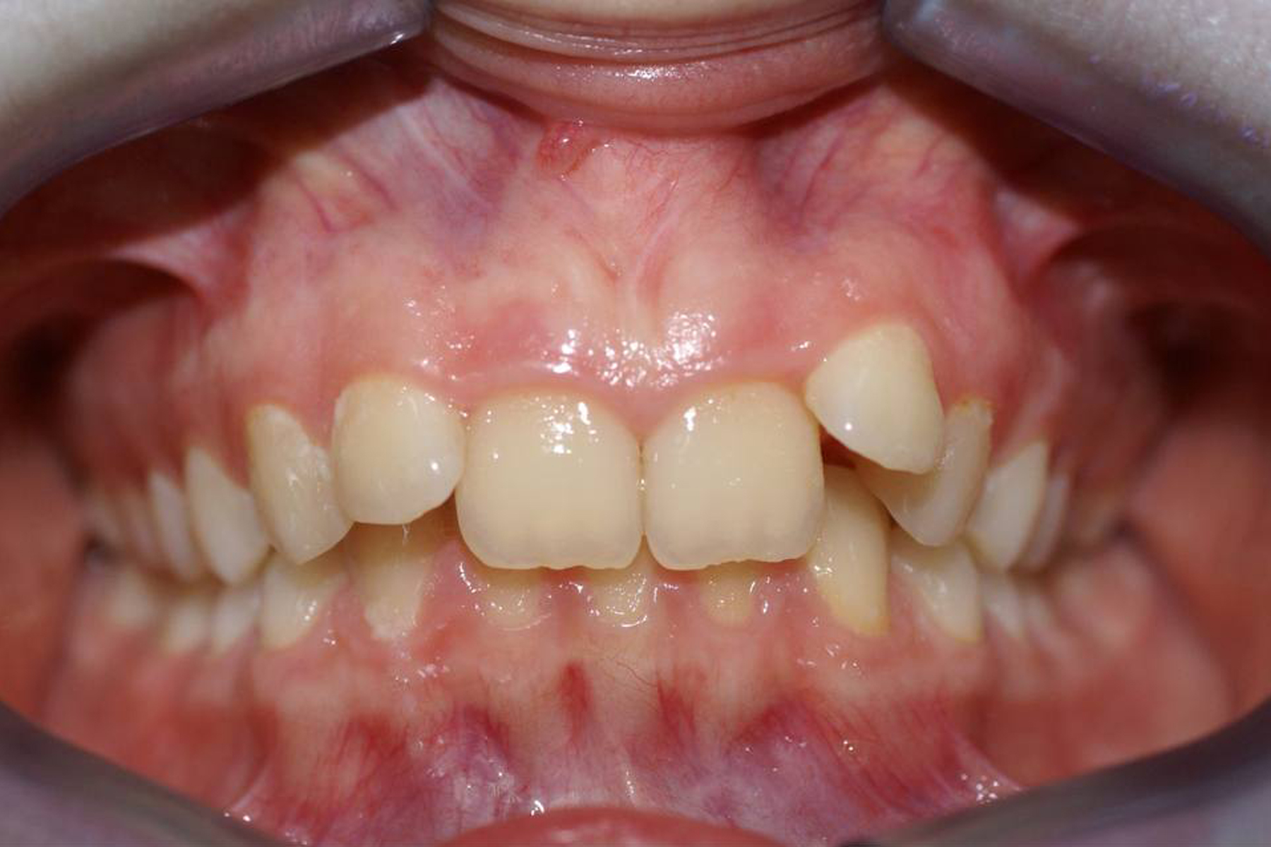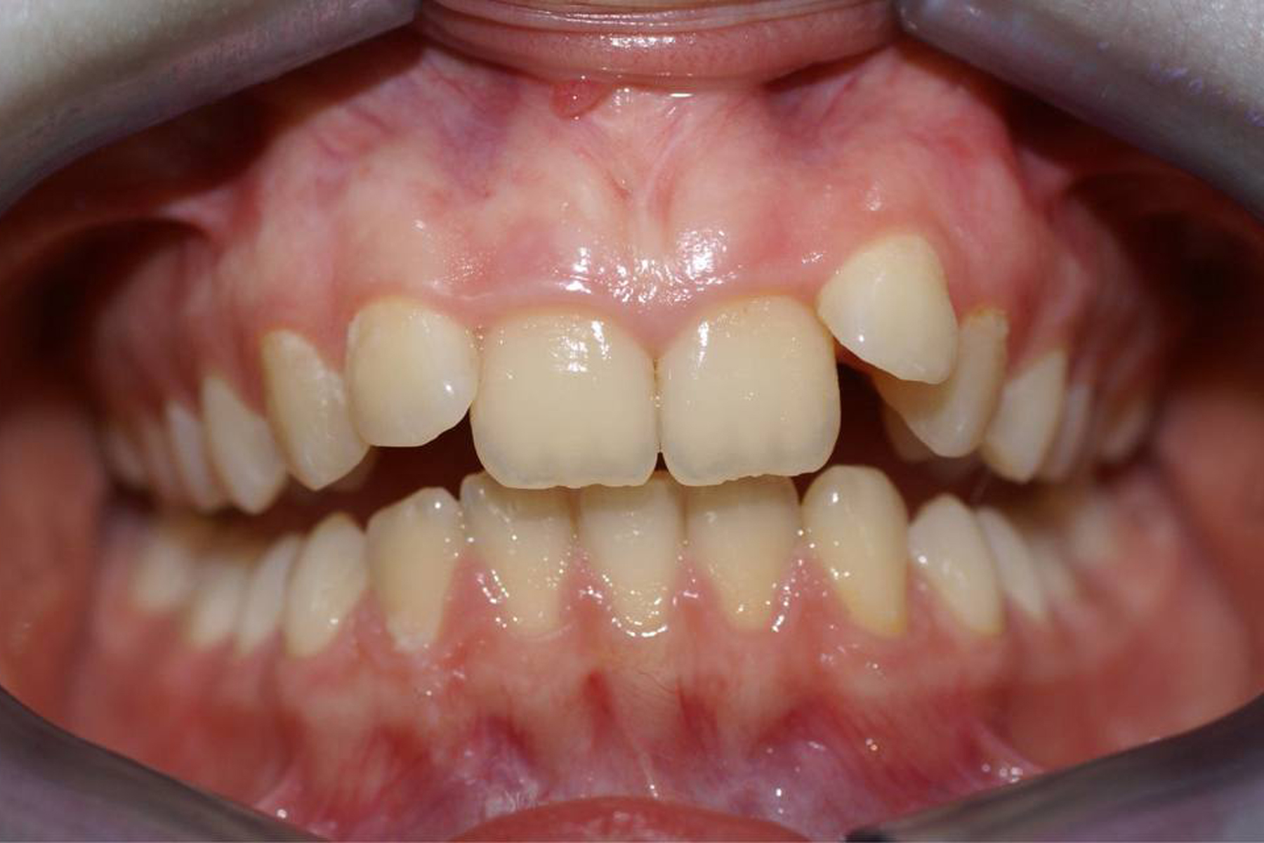 Летрузия (внутреннее положение) верхних центральных резцов, глубокий прикус.